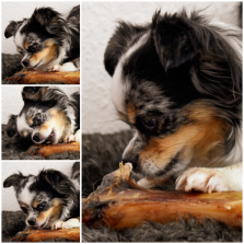 Ich heiße Pina und bin 5 Jahre alt. Ich bin ein Chihuahua und zähle zu den kleinsten Hunden auf der Welt. Ich habe eine ganz besondere Fellfarbe die man Merle nennt. Mein Herrchen hat mir den Knochen von Anifit bestellt damit ich nicht mehr seine Schuhe anknabbert. Der Knochen schmeckt mir sehr gut. Aber ich habe schon ganz schön zu tun, der Knochen ist ja nun fast größer wie ich. Bei schönem Wetter darf ich ohne Leine bei uns im Garten rumflitzen und mein Kauvergnügen ausleben.